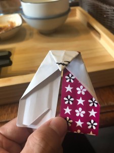 - 兩邊對折後,在中間摺成三角形