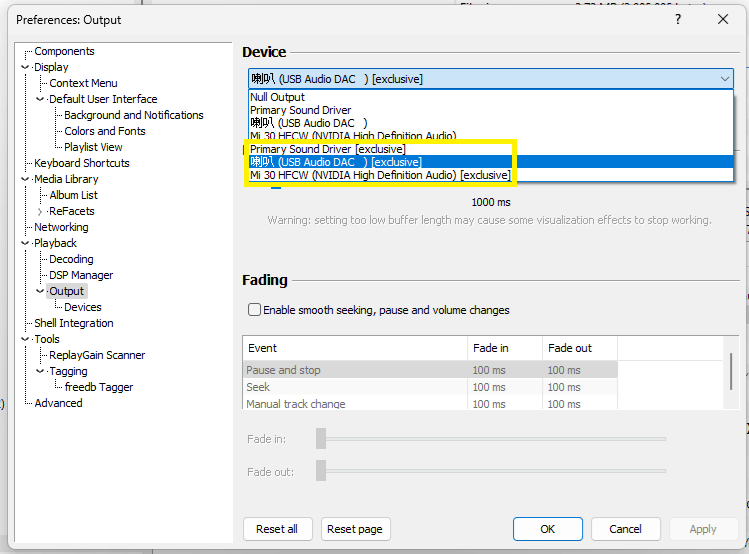 NOTE: 獨佔模式要選擇 Output 的 Device 選擇後面有[exclusive]的。