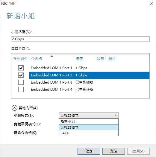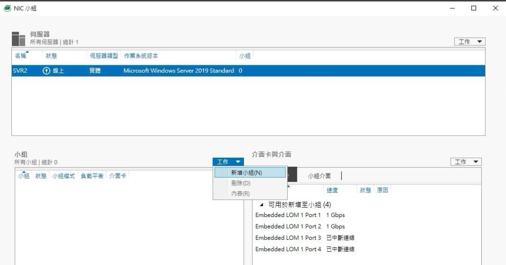 如同 Linux 系統的網路合併 network bonding 功能,Windows Server 對應的功能則是 NIC Teaming。能夠將多個線路合併以避免因單一線路異常導致服務中斷,同時也能藉此服務提高單一服務IP的網路速度(需使用支援的網通設備)。