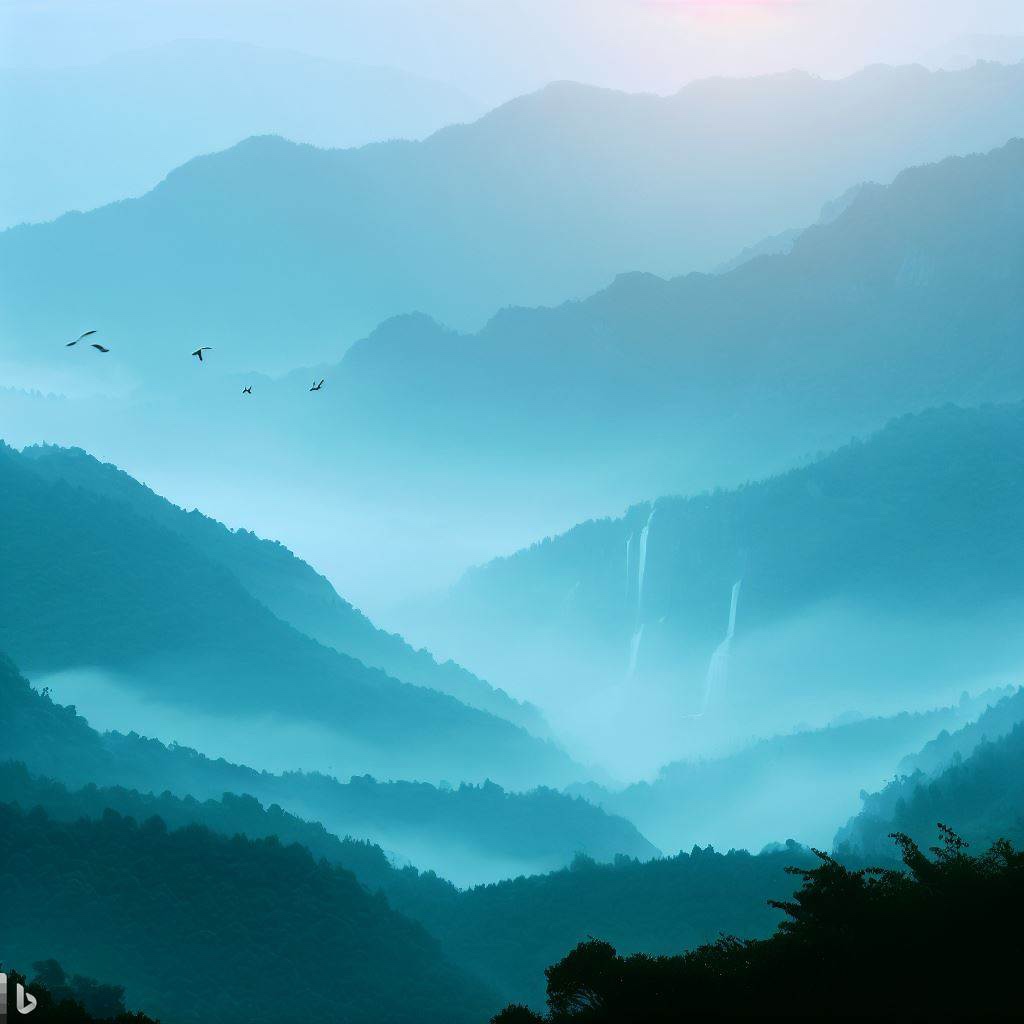 清晨,青山蔚藍,曉雨輕柔如絲。 遠方傳來雁的鳴叫,它們在天空中自由地飛翔。 海天交接處的鳥兒翻飛,歌聲響徹浩瀚的天際。